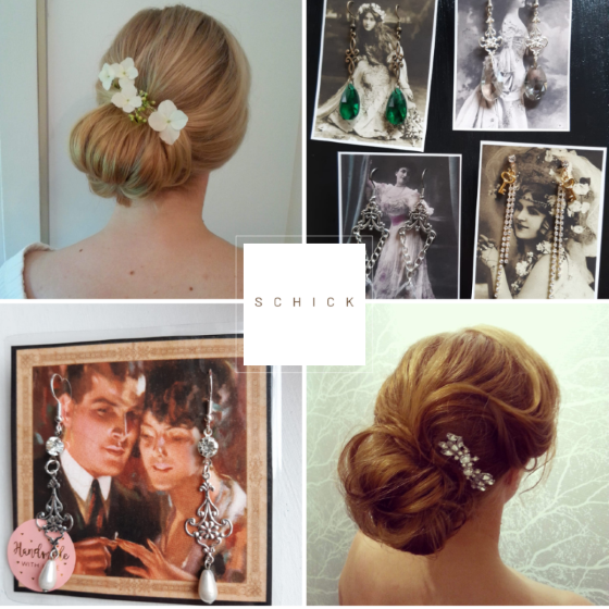 Schickissä yhdistyy nykypäivän rohkeus ja vanhanajan glamour. Salongin puolelta saat juhlaasi upean kampauksen ja meikin, myymälän puolelta voit löytää teemaasi sopivan mekon, kengät ja korut. Jos et löydä hinnastosta sopivaa palvelua, kysythän rohkeasti! Isommat ja aikaavievät työt on hyvä sopia erikseen.