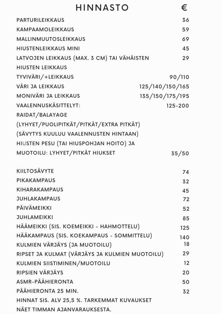Jos haluat useamman palvelun, tai muokata palveluja itsellesi tai ystäväporukalle sopiviksi, kysy tarjousta! Mahdollisuus viettää esimerkiksi after work edullisin pikakampauksin. Täällä ei nuttura kiristä!